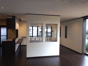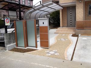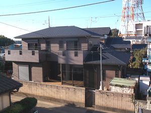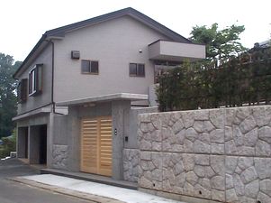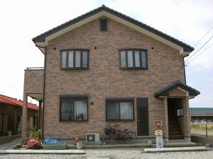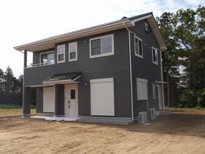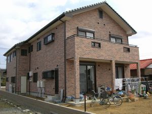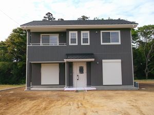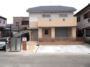 1階外壁と外溝を茶系で統一して、2階の外壁を白系にしたシンプルナチュラルな外観の建物です。